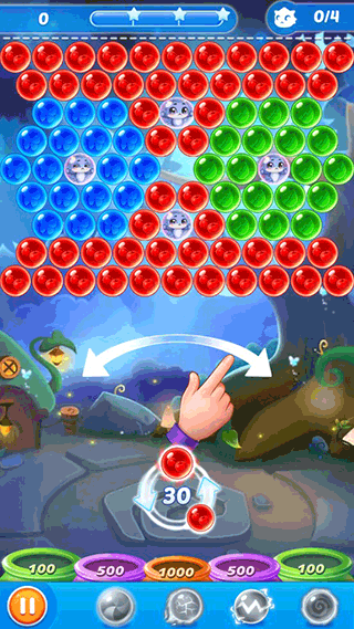 将手中泡泡射向同色区域,三颗以上即可清除。