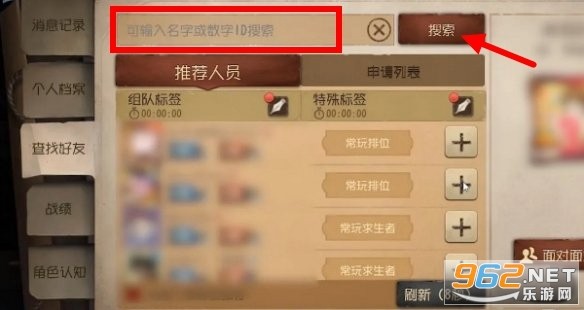 3、再输入框中输入对方【名字或者数字id】点击【搜索】。
