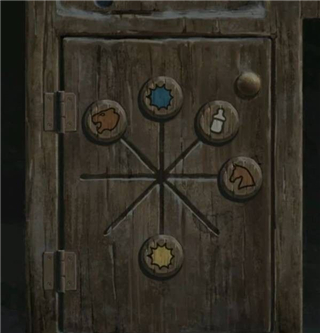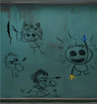 2、墙画与柜子机关相连,按虎头↖奶瓶↗木马→蓝↑黄↓取剪纸人及锦旗。