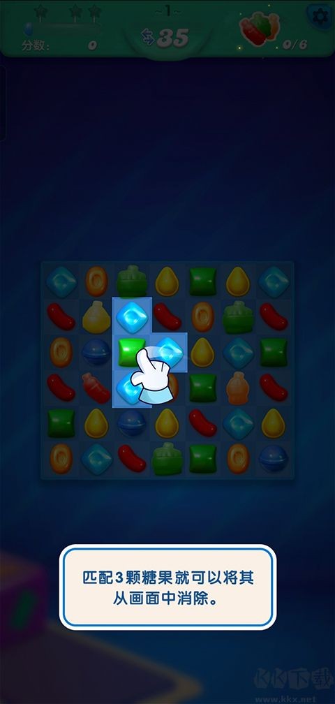 2、蜂蜜模式:解救被蜂蜜困住的糖果熊。消除蜂蜜旁的糖果来解救它们,蜂窝数量显示需要消除的次数。