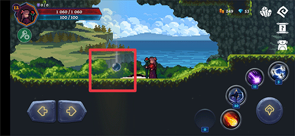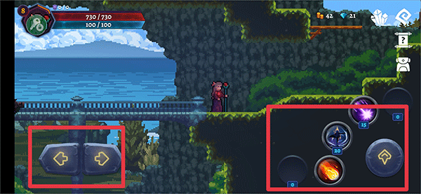 1、进入游戏后,利用左下角左右按钮操控角色的移动,右边向上按钮为跳跃,其他按钮分别为角色的技能。