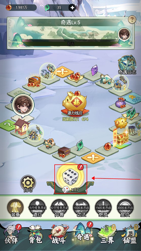 通过任务获取骰子,掷点数可探索地图并升级奇遇等级。