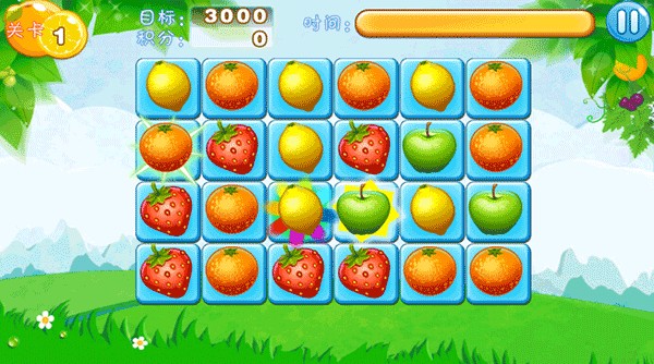 3、游戏开始,你需要找到三个或以上的相同水果,可以选择横向或者列向的,连接它们即可进行消除。消除的数量越多,得到的分数就越高;
