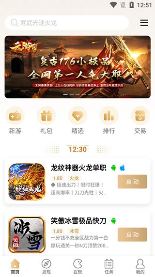 首页可浏览榜单、礼包、精品推荐及交易板块内容。