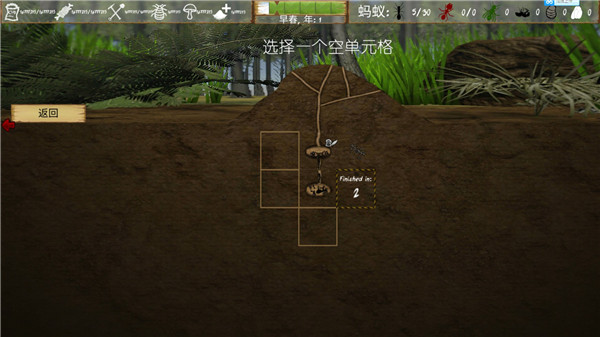 1、化身蚂蚁探索道路,沿途收集食材,填充巢穴。