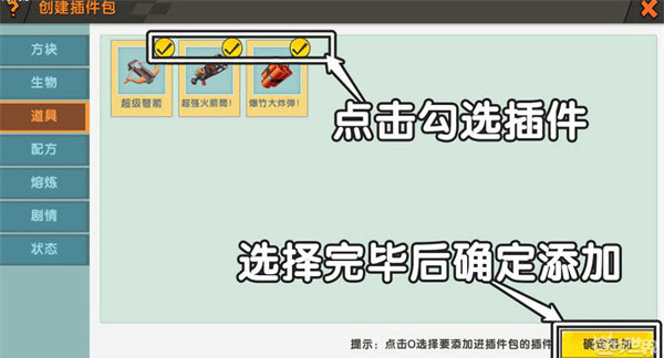 当然,冒险家们也可以制作多种类型的插件来制作插件包,例如武器、生物、方块等等,你也可以把自己制作的微缩模型应用在插件上,除此之外,新版本还增加了局部触发器功能,可以直接将触发器设置在插件上并且可以直接打包哦~