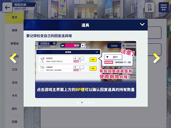 还有就是使用小喇叭和哨子,小喇叭可以回复10个BP每次,哨子可以回复1个BP每次,这个道具就比较好了,哨子可以在充值页面充值应援月卡每日可以获得5个。