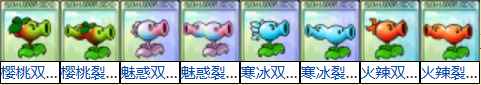 ①使融合豌豆植物(樱桃双发射手/樱桃裂荚射手/魅惑双发射手/魅惑裂荚射手/寒冰双发射手/寒冰裂荚射手/火辣双发射手/火辣裂荚射手)立即获得一次点击升级的机会