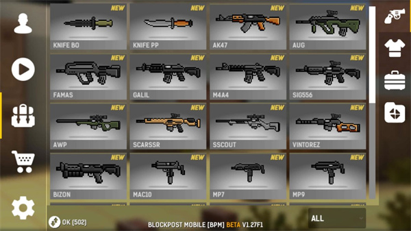 该游戏拥有多种不同类型的武器库,可以升级,包括五十多种型号,例如: • 折叠刀和直刃刀(karambit、balisong 等)。• 具有不同威力和射速的手枪。• 来自主要武器制造商的冲锋枪。• 霰弹枪和滑膛步枪。• 自动、半自动和狙击步枪。• 重机枪和手榴弹。