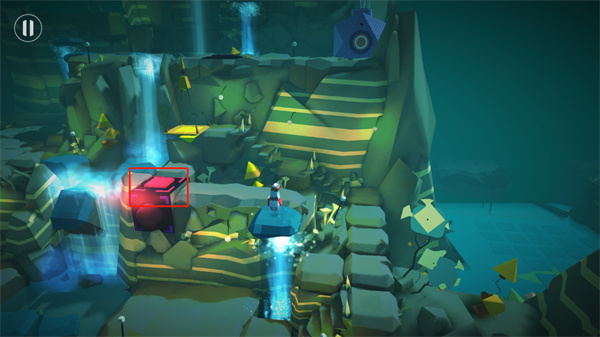 3、玩家顺着小精灵移动到下图的位置上面,然后踩住机关,会发现出现一个石头,然后在点击红色的按钮就可以出现又一个石头,然后就可以顺利的通过瀑布了。