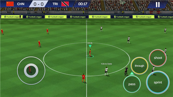6、开始比赛后,左边为控制移动,右边最大的图标【sprint】是加速奔跑,【pass】传球,【through】射门,【shoot】铲球。