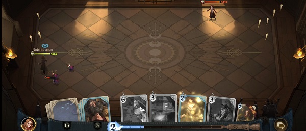 在比赛开始的时候,我们首先使用罗宾,由于他技能和普攻都自带AOE,玩家们能够轻松利用罗宾消灭掉场上的控场生物,给玩家的中慢速卡组腾出时间,打出魔力差。中期在面对敌方强力驻场生物的时候,我们可以派出尼珊德拉直接消灭掉这些强力生物。