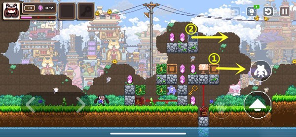 1、来到1-3关。将1号箱子往右推动两格,踩着1号箱子跳上去把2号箱子推下来。