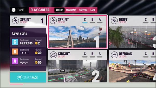 2、游戏里的赛道遍布于多样环境,如山林泥地、城市街道、雪原冰面与沙丘丘陵等。