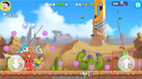 4、左边的按键是下蹲,当遇到柱子等障碍物的时候,按住下蹲即可成功通过。