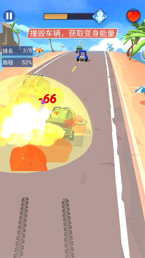 2、玩家需要撞毁其他车辆,争夺比赛的胜利,并获得变身能力