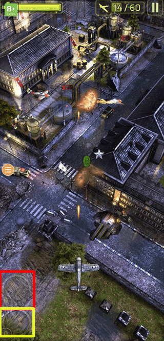 3、玩家进入游戏后,左右滑动屏幕可移动飞机,点击红色方框内的按钮丢炸弹,而黄色方框内的按钮则是短时间内加大子弹攻速。