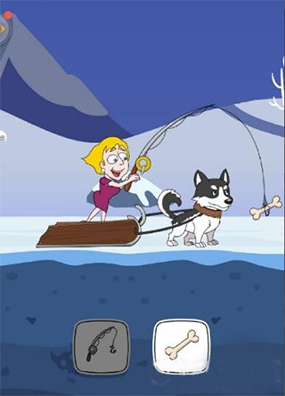 第3场景:小姐姐坐到一个狗拉雪橇上,选择鱼竿,然后鱼竿上掉着骨头,吸引狗狗前进。