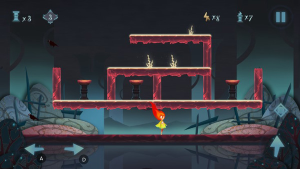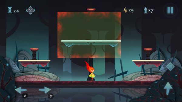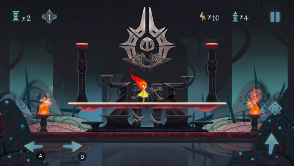 1、在第一关中,玩家先点击画面左侧的方向键进行左右移动,经过左右两边火炬将其点亮。