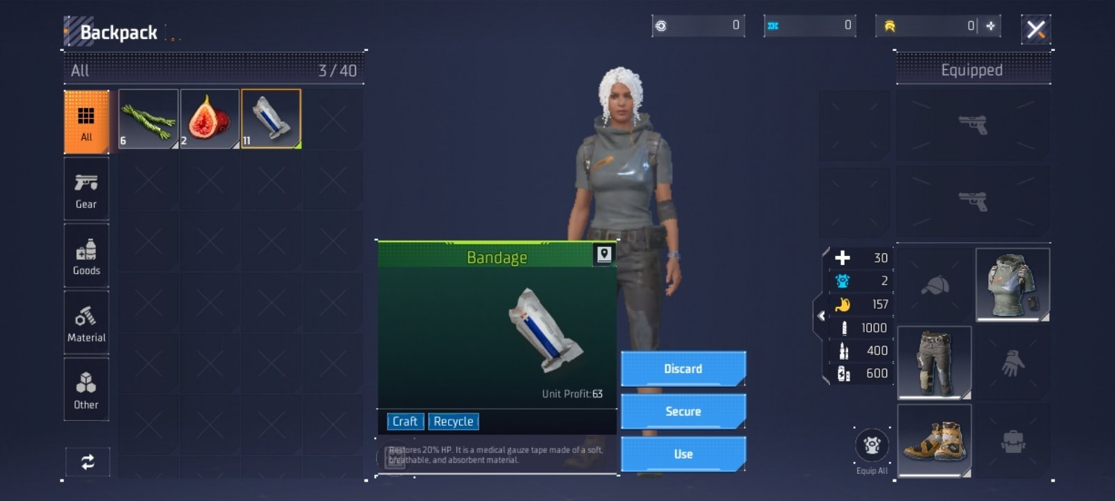 4、玩家在游戏中也会面临饥饿和受伤,记得使用背包里的物资以进行补充。