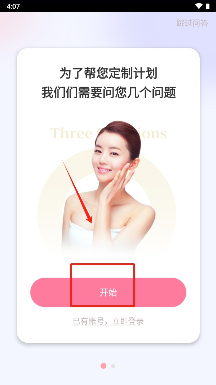 1、打开进入魔镜面部瑜伽软件来去点击“开始”按钮,定制护肤计划。