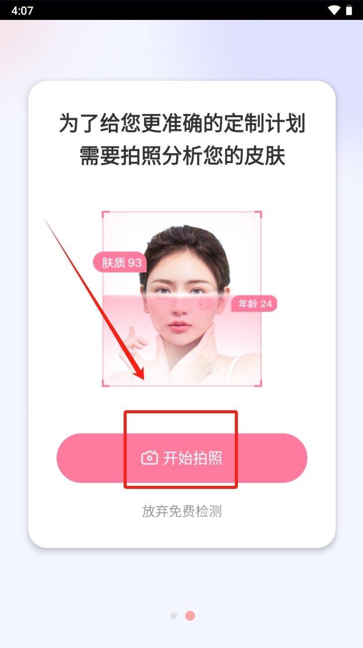 2、可以去点击“开始拍照”就能够去上传照片以分析皮肤状况。