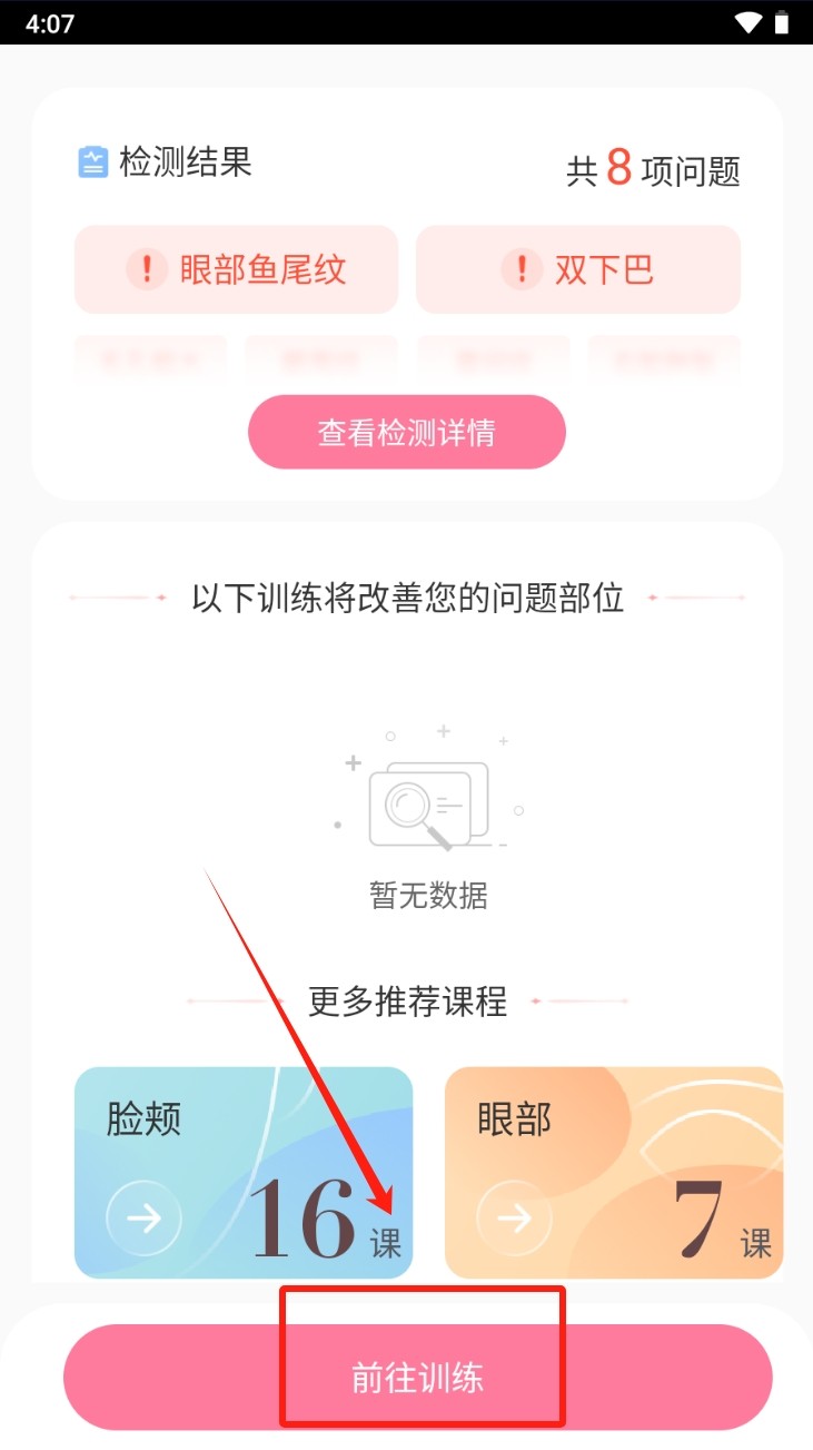 3、这样就可以去查看检测结果,点击“前往训练”开始改善皮肤问题。