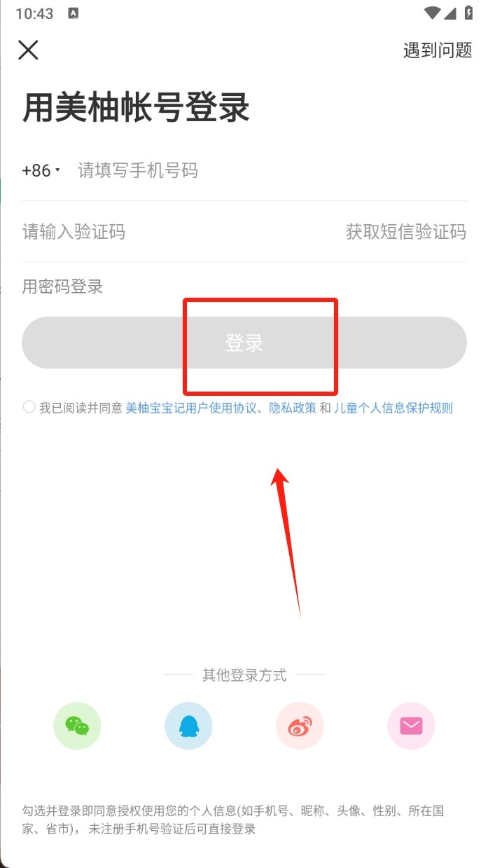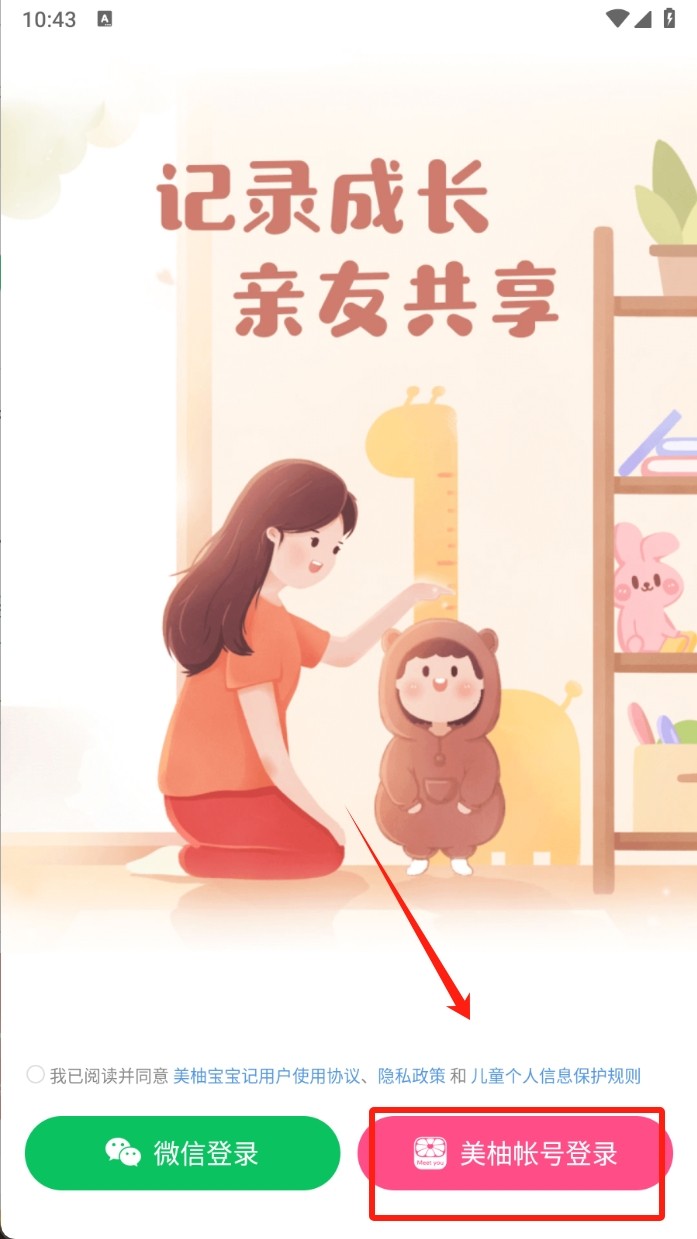 1、打开美柚宝宝记成长记录进行登录,可以方便地使用已有账号信息。