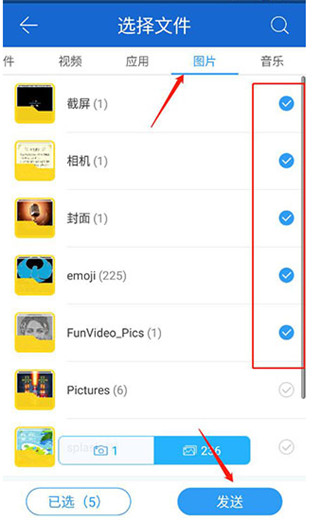 在发送界面选择“图片”分类,勾选图片后点击发送进入配对。