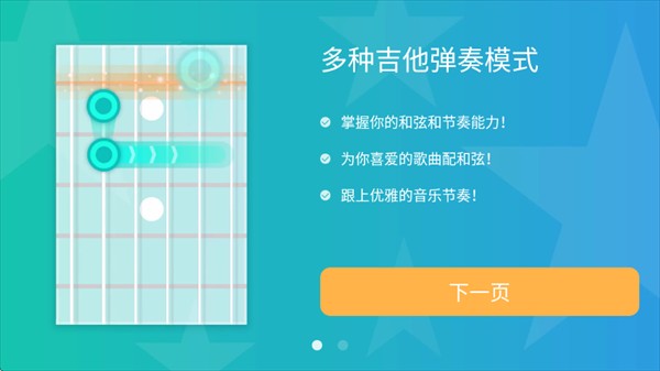 1、多种吉他弹奏模式掌握用户的和弦和节奏能力,为用户喜爱的歌曲配和弦,跟上优雅的音乐节奏。