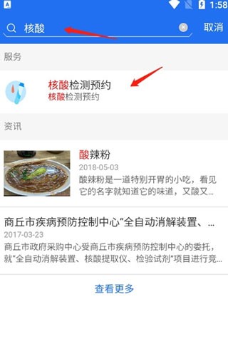 3、在搜索栏中搜索"核酸",然后点击核酸预约检测。