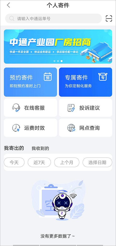 6、个人寄件中支持预约寄件、网点查询、投诉建议等信息。