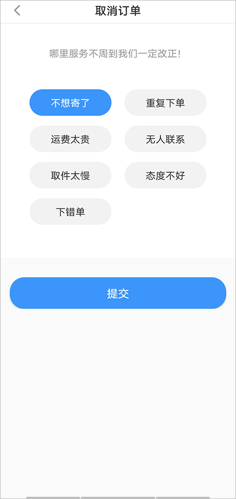 2、如果快递员还没上门取件,可以在订单界面点击“取消订单”,选择一个取消原因,具体由实际情况选择。最后点击提交这样就可以成功取消订单了。