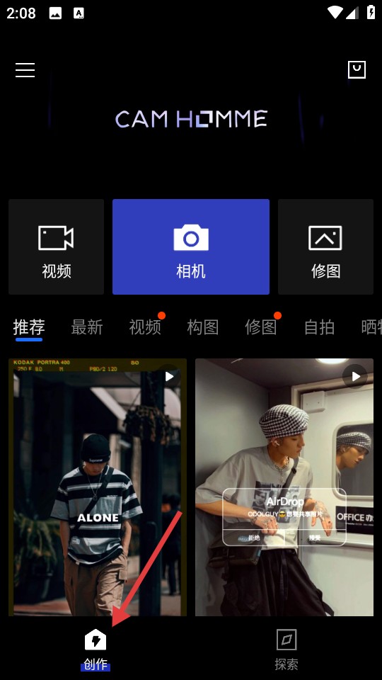 2、APP界面顶部功能视频、相机、修图,分类标签推荐、最新、视频、构图、修图、自拍、晒,底部导航有创作、探索,还有展示的男生穿搭、街拍等作品。