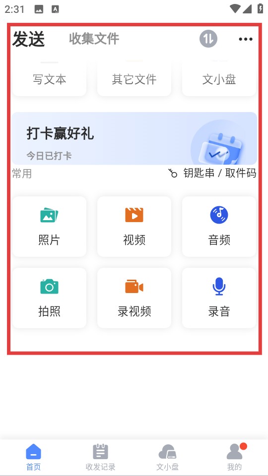 首页可选择文本、照片或其他类型文件,常用功能区助你快速创建并发送。