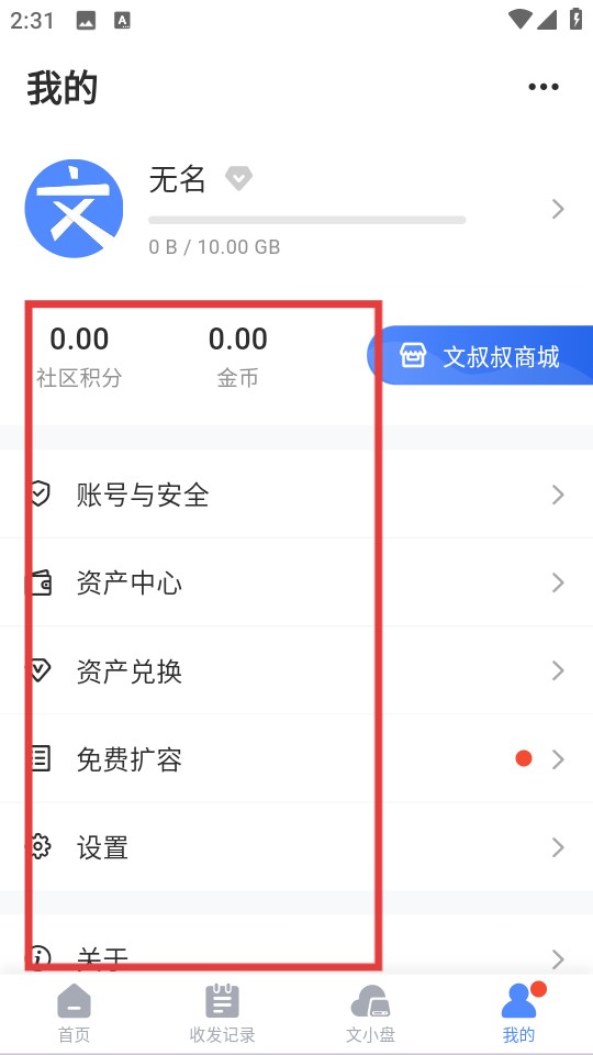 “我的”界面展示用户名、存储使用量及积分金币,并可进入安全、资产等功能区。