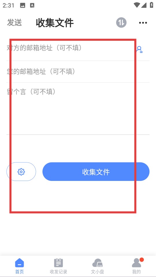 在收集界面填写收件邮箱、发件邮箱与留言,点击按钮即可发起文件收集。
