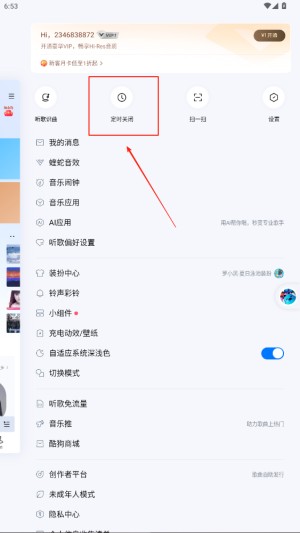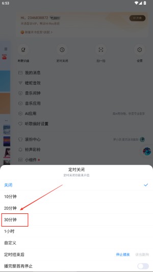 3、选择定时关闭功能,设置音乐播放的关停时长。