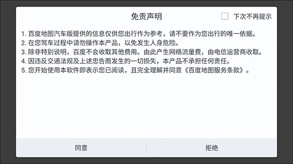 1、下载安装本站提供的百度地图车机版,首次使用需要同意用户协议;